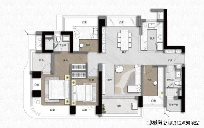 123/126㎡四房两厅两卫:南北通透,约 4.2 米宽厅,LDKB 一体化设计;四开间朝南,六大凸窗 + 设备平台;主卧套房带独立卫浴与 270° 飘窗,适合三代同堂的改善家庭。