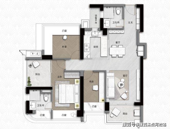 92㎡三房两厅两卫:刚需首选,双龙抱珠格局,动静分区清晰;客厅连接阳台,主卧套房带 270° 环幕飘窗,得房率约 90%,适合深港通勤刚需家庭。
