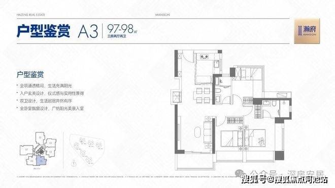 96-98㎡3房2厅2卫03/05/06(A2/A3)户型,设计的是经典竖厅三开间朝南格局,客厅3.5米开间,LDKB一体化,S墙设计预留冰箱卡槽位,主卧+1个次卧双飘窗。