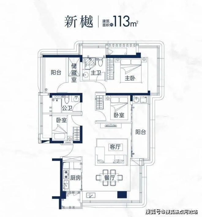 主力 90-124㎡三至四房,得房率约 82%(含赠送可达 94%),片区罕见 3.1 米层高,远超普通住宅 2.8 米标准,空间通透朗阔。三梯四户配比,告别电梯拥挤;90㎡三房两厅两卫,主卧带转角飘窗,U 型厨房动线合理;113㎡横厅四房,南北通透,5.6 米巨幕阳台连接次卧,采光通风俱佳。