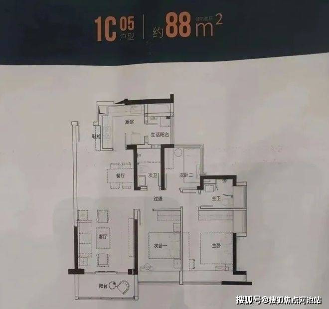 88㎡的3房2厅2卫(1栋C座05户型),设计的是竖厅格局,客厅3.8米开间,动静分区,三开间朝南,主卧大套间设计,L型厨房,还带1个生活阳台,得房率:77.27%(不含赠送),阳台东南朝向。