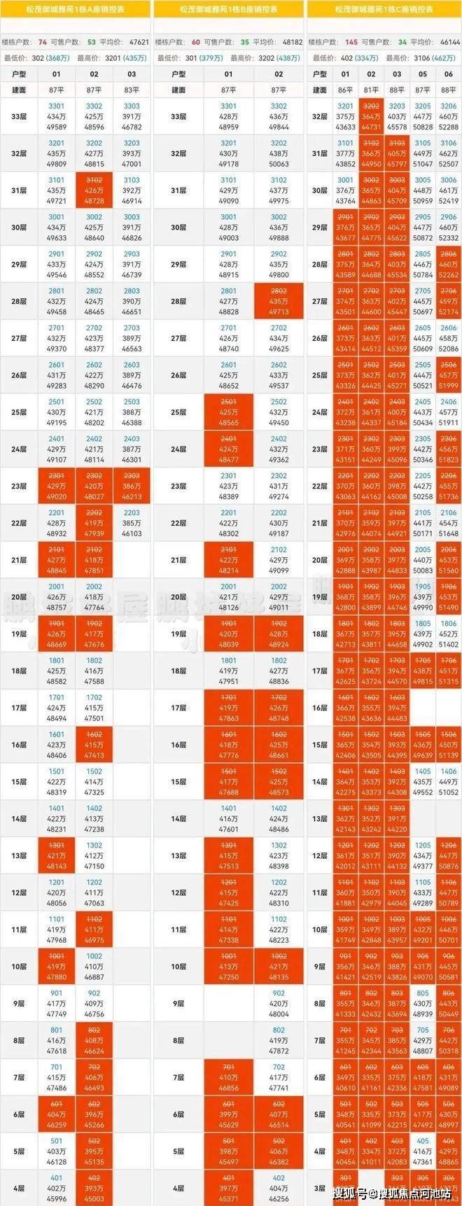 松茂御城从开盘至今,已经备案了157套房源,剩余122套,去化达到了56.27%,不过1栋B座虽然取得了预售,但是实际上到目前为止都没有推出来卖的,在售的只有1栋A座跟C座,开发商也给出了85折优惠,折后价格如下: