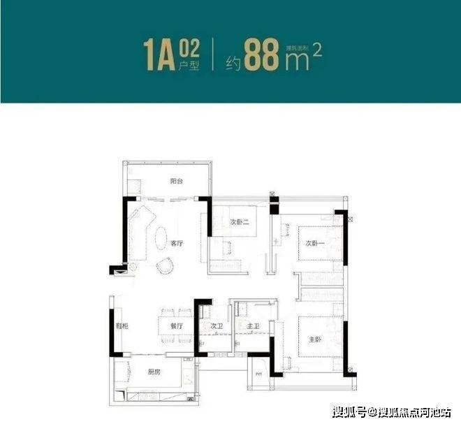 88㎡的3房2厅2卫(1栋A/B座01.02户型),设计的是竖厅南北通透格局,客厅3.8米开间,动静分区,主卧大套间设计,U型厨房,得房率:79.61%(不含赠送),阳台主朝西北向。