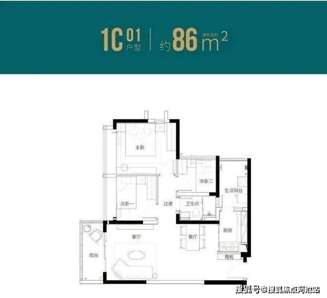 86㎡的3房2厅1卫(1栋C座01户型),设计的是竖厅格局,客厅3.6米开间,动静分区,三开间朝南,L型厨房,还带1个生活阳台,得房率:77.27%(不含赠送),阳台西南朝向。