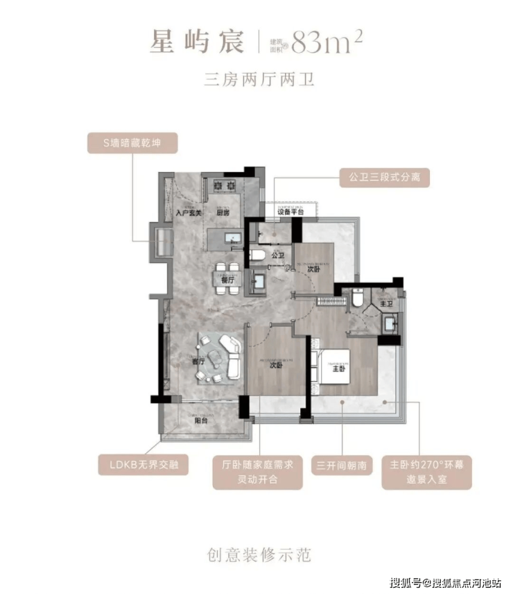 ✅ 主力户型&价格详情:83㎡3房2卫,折后总价299-320万/套,单价3.63-3.88万/㎡,经典竖厅设计,LDKB一体化,三开间朝南,U型厨房,公卫三段式干湿分离,赠送1.98㎡设备平台,阳台5.02㎡,整个小区仅112套,十分稀缺;