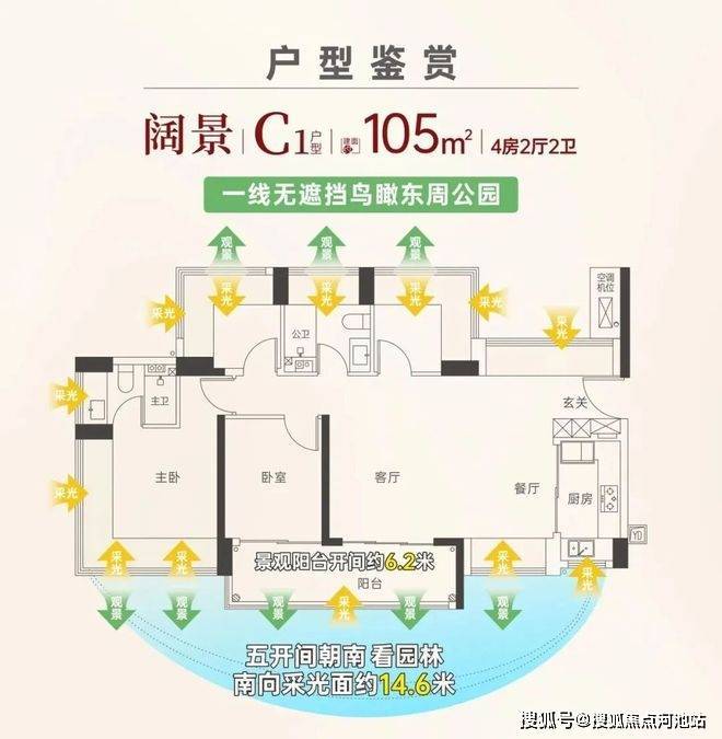 105㎡的通透双阳台户型。注意看这个细节,有部分户型实现了客厅双面采光。这在T6塔楼的布局里极为罕见,直接解决了传统中间户的通风和视野痛点,让穿堂风不再是边户的专利。
