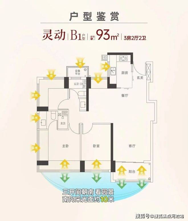 建面约93㎡3+1房两卫户型:当市面上的其它产品还在将93㎡做成普通的三房时,天境云玺则做到了"3+1"房的灵动可变户型。