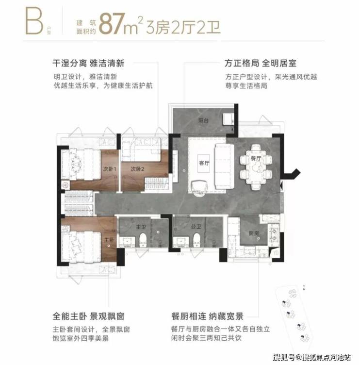 87㎡的3房2厅2卫,设计的是横厅南北通透格局,餐客厅一体化,U型厨房,得房率80.3%(不加飘窗),全屋飘窗设计,阳台主朝东北向。