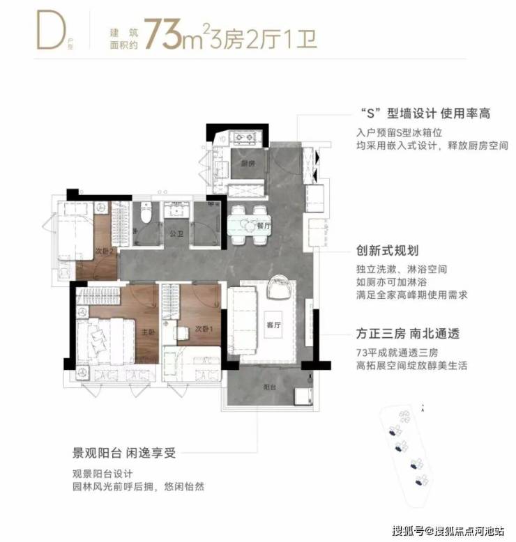 73㎡的3房2厅1.5卫,设计的是竖厅格局,客厅3.1米开间,入户预留S型冰箱位,三开间朝南,U型厨房,创新式卫生间设计,独立洗漱,沐浴空间,如厕也可加沐浴,得房率80.3%(不加飘窗),都是西南朝向。