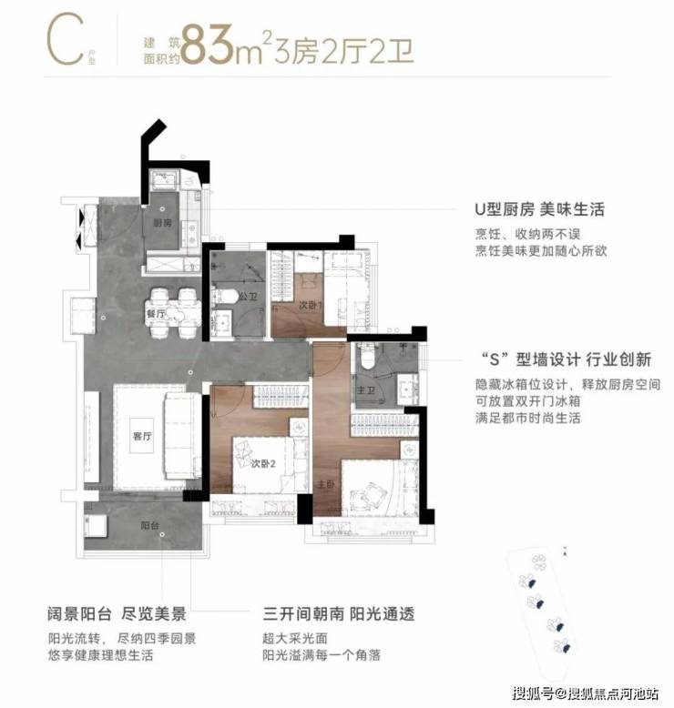 83㎡的3房2厅2卫,设计的是经典竖厅格局,客厅3.3米开间,入户预留S型冰箱位,可以放双开门冰箱,三开间朝南,U型厨房,得房率80.4%(不加飘窗),客厅阳台全部东南朝向。