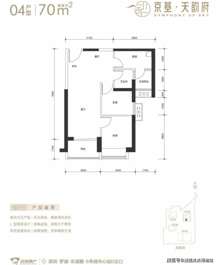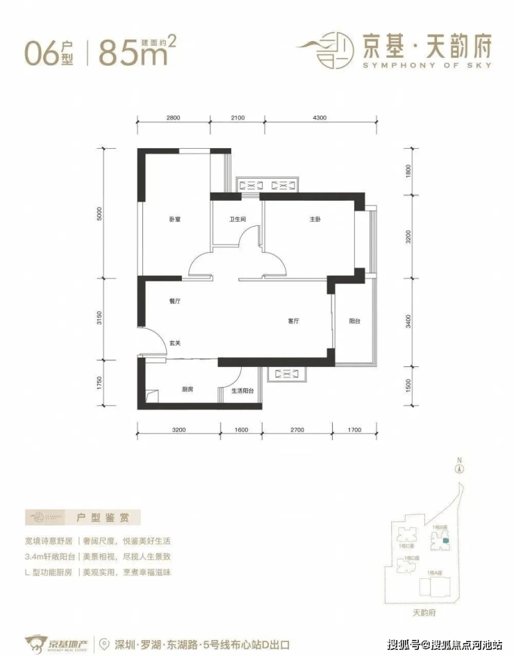深圳【京基天韵府】已全面开盘,看房需来电进行预约,目前推出1栋B座,244套房源。面积有70-85㎡的2房1卫,105㎡的3房2卫,120-150-180㎡的4房2卫户型,项目位于罗湖区东湖街道,西临东晓路,北临东湖路,东临丹平快速路,距离5号线“布心站”300米,7号线“太安站”700米范围内,属于“双地铁”物业。