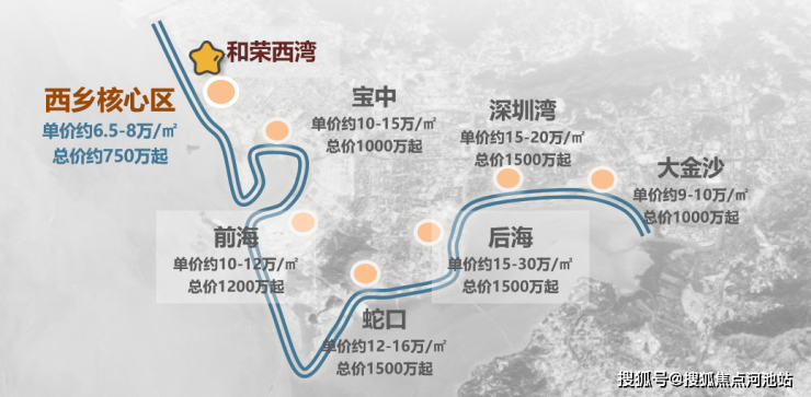 和荣西湾项目处于深圳西部海岸线上,一路串起 西乡、宝中、前海、蛇口、后海、深圳湾、大金沙 等片区。沿线高端住宅齐聚,寸土寸金,房价基本都在 9-10万/㎡,深圳湾一号 等标杆豪宅更是片区天花板。