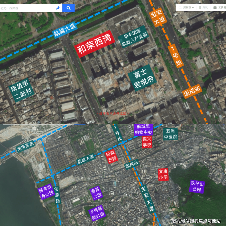 和荣西湾家园,位于宝安区西乡街道航道大道与宝安大道交汇处,地铁1号线 “固戍站” D出口,距离约200米。项目东侧是 华丰国际机器人产业园,南侧是 富士君悦府,周边1公里内有 3大公园环绕,分别是 西湾滨海公园,南昌公园,铁仔山公园。