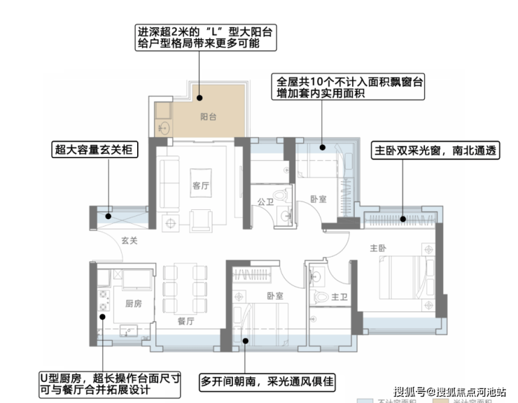 ●配备局部进深达2.1米、约6.2㎡的L型大阳台;