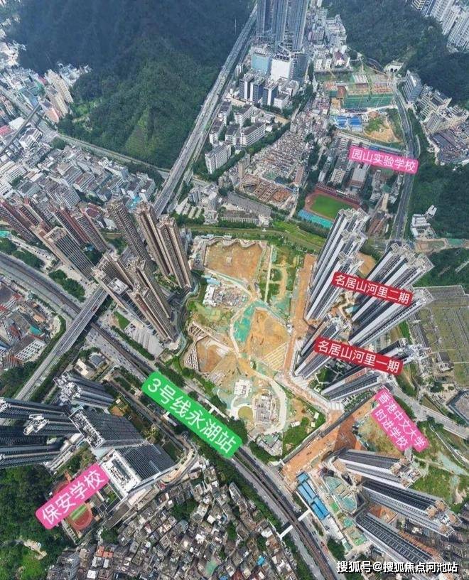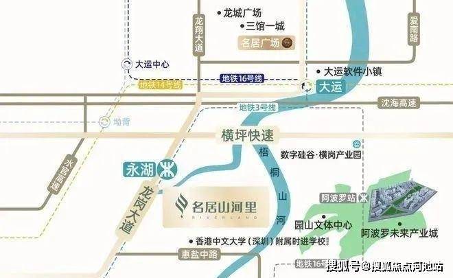 名居山河里,位于深圳市龙岗区园山街道3号地铁线永湖站东南侧150米,地处龙岗黄金三角地带,北邻大运新城,东侧是阿波罗未来产业城,西南侧是横岗中心片区。