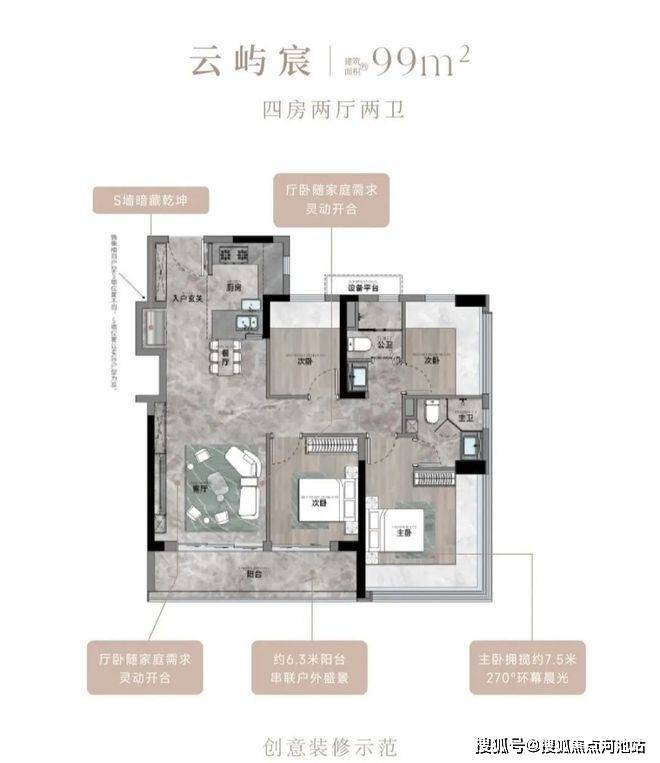 99㎡的4房2厅2卫,设计的是竖厅格局,客厅3.35米开间,LDKB一体化,S墙设计预留双开门冰箱卡槽位,三开间朝南,动静分区,U型厨房,公卫三段式干湿分离,赠送设备平台,得房率约78.27%(不含赠送),客厅连接次卧出9.37m²大阳台西南或东南朝向。靓点:99平做到了4房2卫,主卧270°无柱转角飘窗,厨房烟道外置+额外赠送设备平台,并且是纯南向格局。