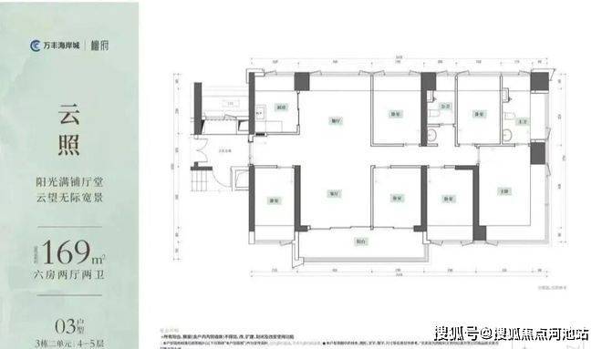 169㎡的6房2厅2卫,设计的是竖厅南北通透格局,独门独户,赠送私用公区走道,客厅4.15米开间,餐客厅分离设计,五开间朝南,U型厨房,公卫三段式干湿分离,得房率约100%(包含赠送),7.05米长的超大观景阳台约12.33m²主朝东南向。赠送面积约31.69m²。