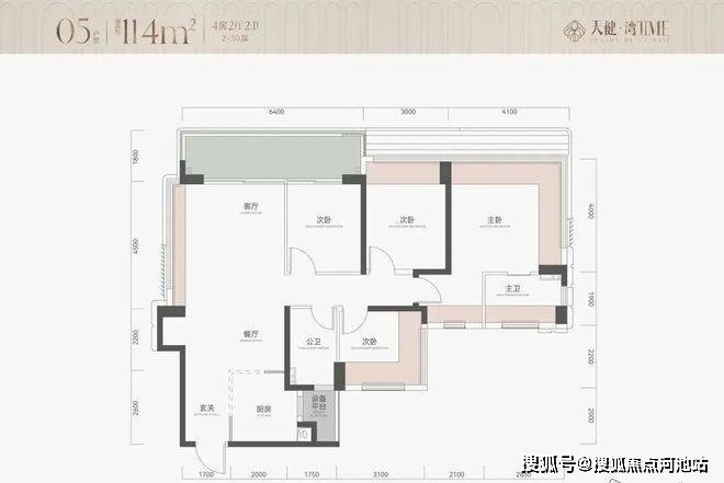 115㎡4房2卫,横厅户型,朝南看海,入户独立玄关,但三个次卧朝北;