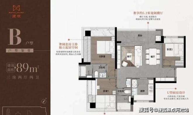 B 户型以其横厅通透的设计,深受年轻家庭的青睐。折后约 7.1 万 /㎡,总价 620 万起,价格十分具有吸引力。客餐厅开间达 5.2 米,采用双龙抱珠户型,实现了良好的南北对流效果,在炎热的夏季,室内能够自然通风,凉爽宜人,使用率更是高达 98%。
