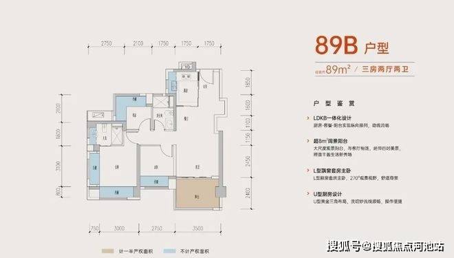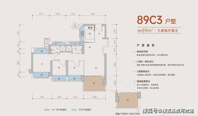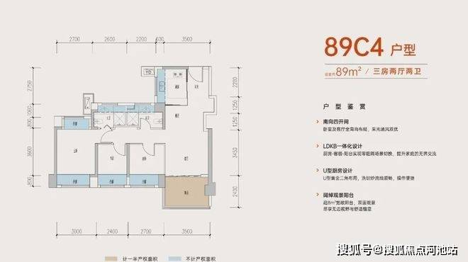 89㎡的3房2厅2卫,B户型,设计的是经典竖厅格局,进门入户玄关,客厅3.5米开间,LDKB一体化,动静分区,三开间朝南,S墙设计预留冰箱卡槽位,主卧+1个次卧270°飘窗,分别做到了主卧15.1㎡/次卧8.52㎡/次卧7.77㎡(包含墙体飘窗),U型厨房,卫生间干湿分离,得房率约:77.39%(不含赠送),西南朝向。赠送面积16.96㎡,加上赠送得房率96.84%。