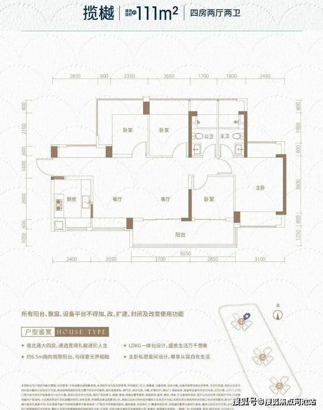 111㎡的4房2厅2卫,设计的是横厅南北通透格局,独门独户,进门入户玄关,客餐厅6.2米开间,LDKB一体化,全屋10面飘窗,主卧南北通,客厅连接次卧出6.8米长的大阳台,U型厨房,卫生间干湿分离,得房率约95.73%(包含赠送),阳台主朝东南向。