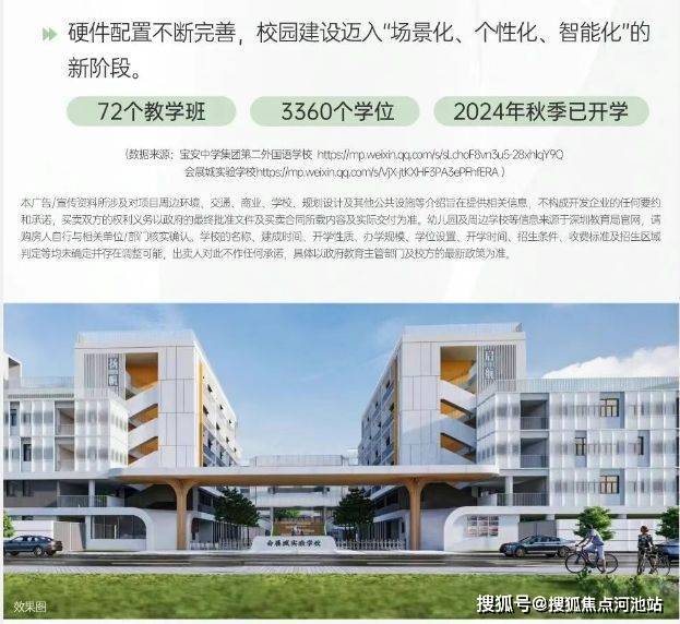 项目直线距离约550米处,是由宝安中学(集团)第二外国语学校创办的九年一贯制会展城实验学校,该校已于2024年开学,72个班、3360个学位,深户购房(100分)可直接就读,非深户购房(75分)需结合当年积分政策[3][6][8]。