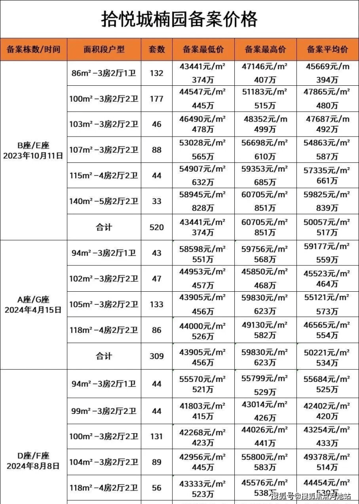 拾悦城二期楠园:2023年10月11号推出来B座、E座一共520套,面积86㎡~141㎡,备案均价50057元,备案总价374万~851万,折扣91折。这个价格开盘的时候卖的很差。后面直接85折+60万免息贷款,成交一下就上来了。