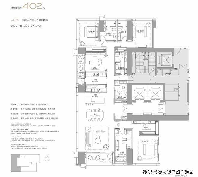 (3-57层)T3栋 四房四卫+家政套间。中西厨分区,餐客西厨一体,带多功能房。端头位置,三面采光。功能完备,房间数充足;实现了主仆双动线;会客观景视野一流。