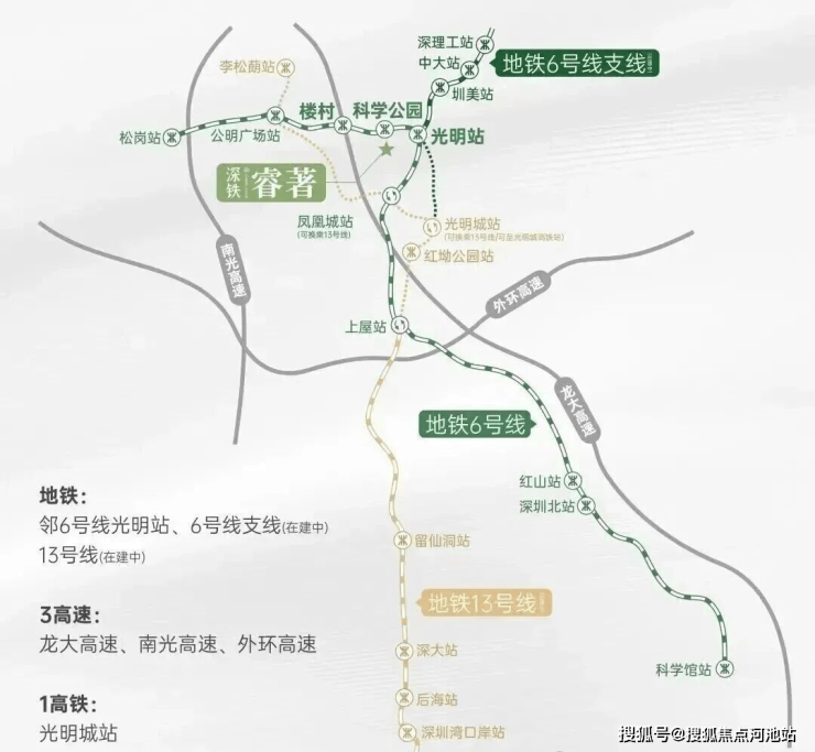 3地铁:邻6号线光明站、6号线支线 (在建中)、13号线 (在建中)
