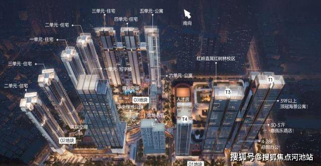 项目总占地约9.6万㎡,总建面约113万㎡,由四个地块组成,分为两期开发。01地块是写字楼+办公公寓+人才房+幼儿园;02地块是一栋写字楼+2栋住宅+8层商业体;03地块是4栋住宅+2栋公寓;04地块是在建中的红岭教育集团红树林校区。