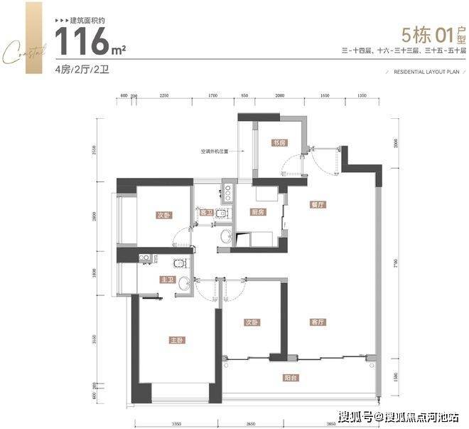 其中,建筑面积约116㎡的4房2卫,是万丰海岸城本次推出的面积最小户型,经典的竖厅格局,动静分区,进门处是一个小房间后期可以打造成书房,厨房连接餐厅,餐客厅一体化,南向约6.5米大阳台连接次卧,主卧带独立卫生间,这个户型最大的亮点就是客厅很大,客厅开间约3.85米。这个户型主要分布在01和02户型,客厅都是西南朝向看小区花园、海岸公园、万丰海岸城商业和深圳外国语宝安学校