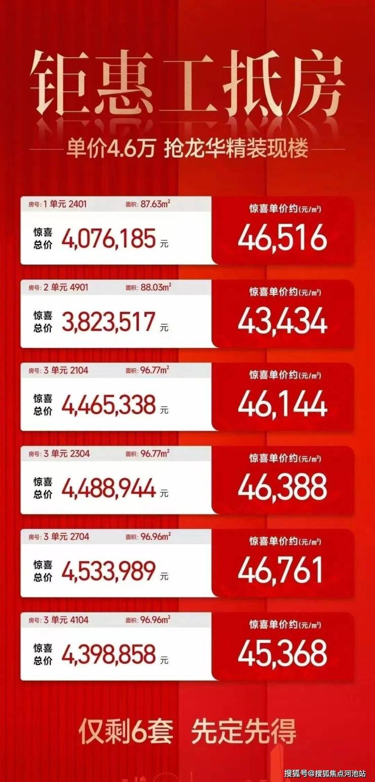 四海华亭在2022年11月入市以来,历时28个月,至今已经销控超780套房源,整体去化率约75%,还有200多套房源在售;据了解,该楼盘在近期还做出了备案价调整,大幅度降价出售,折后均价约4.7万/㎡,总价约400-500万/套。