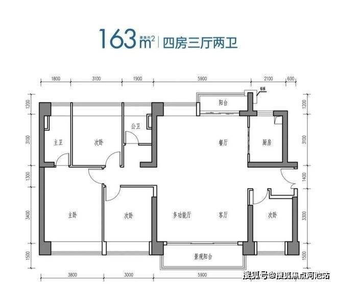 163㎡的4房3厅2卫,设计的是横厅南北通透格局,进门入户玄关,客厅5.9米开间,餐厨一体化设计,南北双阳台,全屋7个飘窗面,4个卧室分别做到了主卧20.14㎡/次卧12㎡/次卧11.47㎡/次卧10.43㎡(包含墙体飘窗),客厅出5.9米长的观景大阳台,U型厨房,公卫三段式分离,得房率约88.25%(包含赠送),阳台主朝西南向。