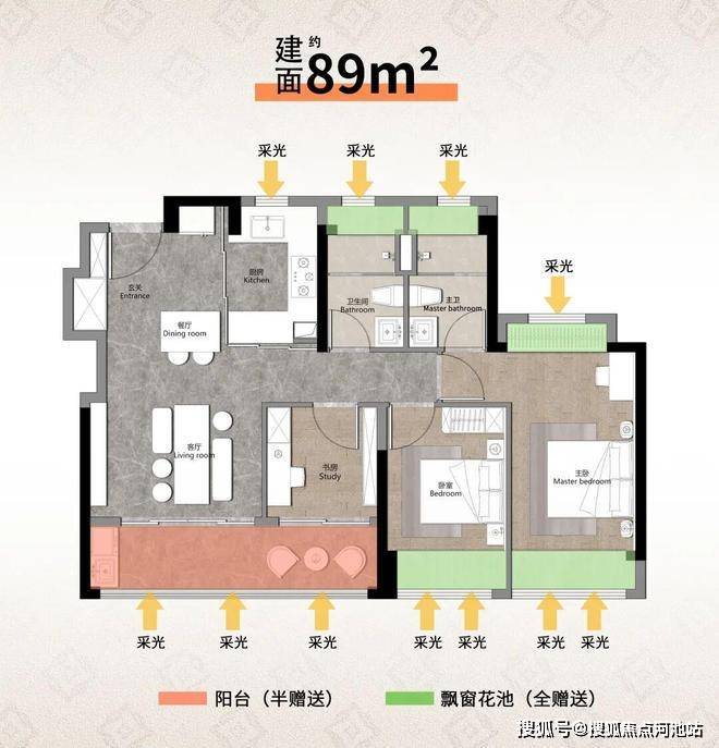 约89㎡三房两卫户型:虽然是入门级产品,却已站上同面积段的品质天花板。四开间全南向采光、近4m客厅、6.4m阳台,卧室三边从容下床。这个面积段,其它竞品做的是"压缩版三房",驭海隽府做的却是真正改善型的"正三房"。