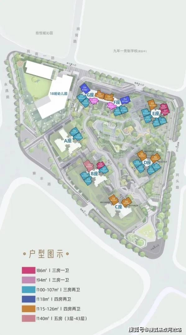 项目6栋高层,1栋幼儿园,户型有86的三房一卫,100、107的三房两卫,115、118的四房两卫,140的五房,户型得房率76%