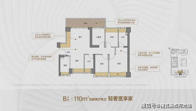 110㎡的4房2厅2卫,设计的是竖厅南北通透格局,客厅4.2米开间,进门户玄关,客厅连接次卧出6.5米长的大阳台,主卧大套间设计,全屋9处飘窗,U型厨房,卫生间干湿分离,阳台主朝北向。