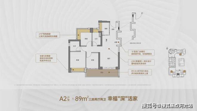 89㎡的3房2厅2卫,A2户型,设计的是竖厅格局,客厅3.5米开间,LDKB一体化,S墙设计预留冰箱卡槽位,客厅连接次卧出5.9米长的大阳台,次卧270度转角飘窗,U型厨房,卫生间干湿分离,阳台有朝西向、东向、南向。