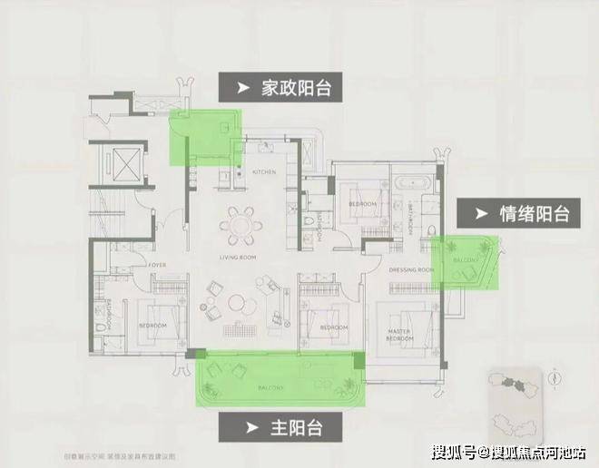 最令人惊喜的是,阳台做了三个,加起来超过32㎡。一个朝向花园的大阳台,放花放草那种;一个主卧独立出去的小阳台,一个人的;还有一个家政阳台,洗晾衣的地方不进入主要动线。三个阳台各有用途,谁都不欠谁的。