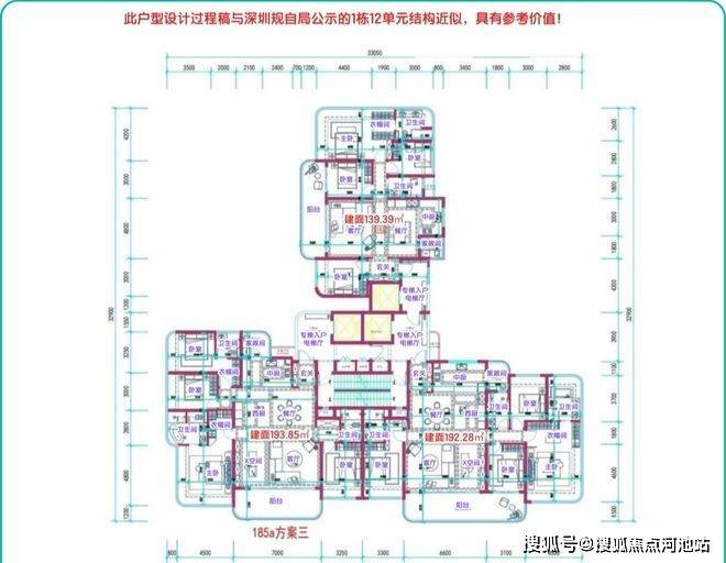 项目采用围合式点式错位布局,2T2户(板楼)和3T3户(塔楼)相结合的设计,确保了户户朝南的优质采光和通风条件。其中,2/3/5/8/9栋为2T2户板楼,产品面积段为193-253-332㎡的大平层;1/6/7/10/11/12栋为3T3户塔楼,产品面积段为140-168-190㎡的4房。这种设计既保证了户型的稀缺性和高端性,又满足了不同客群的需求。