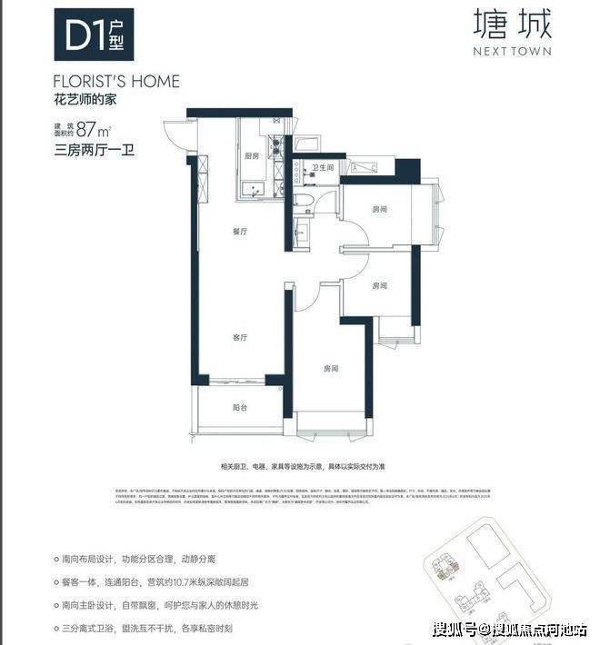 “10.7 m纵深紧凑南向三房”,10.7 m纵深餐客一体,通风采光极佳