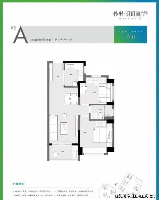 70㎡的2房2厅1卫,设计的是竖厅格局,客厅实测2.99米开间,LDKB一体化设计,进门独户玄关,U型厨房,卫生间干湿分离,得房率:75.61%(不含赠送),西南或东南朝向。