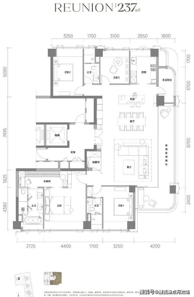 237㎡的4房2厅3卫,设计的是竖厅双龙抱珠格局,一梯一户,专梯入户设计,赠送私用电梯厅,客餐厅8.7米开间,LDKB一体化设计,分别做到了主卧35.3㎡/次卧套间15.93㎡/次卧16.51㎡/次卧12.34㎡(包含墙体飘窗),客厅连接餐厅出8.7米长的超大观景阳台约15.66平,另外东南向还有个观景阳台约10.08平,西厨位置有6.66平生活阳台,U型厨房另设西厨岛台,卫生间干湿分离,得房率约100%(包含赠送),东北朝向。