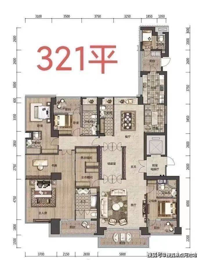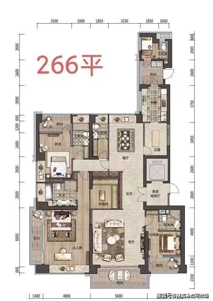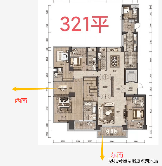 注意:黄色部分是266㎡户型,红色为321㎡户型