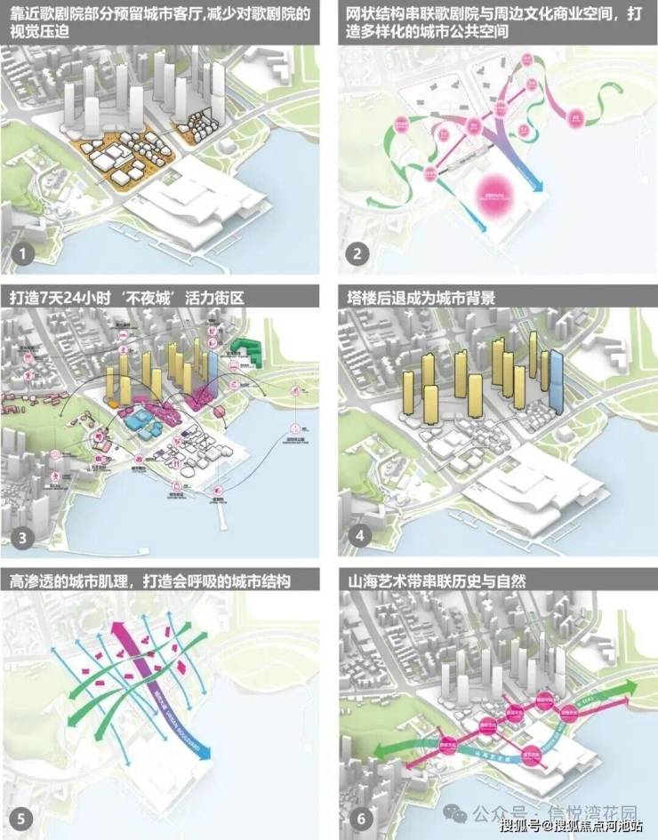Farrells 凭借深厚的城市设计经验,为片区构建了城市升级整体框架 —— 以歌剧院为核心文化支点,将其单点能量拓展为 “山海连城・湾区门户・艺术街区” 的复合文化圈,打造兼具自然禀赋与人文底蕴的城市名片,为深圳从 “功能城市” 迈向 “人文城市” 谱写关键篇章。这一转型愿景的落地,则通过三大核心规划策略实现: