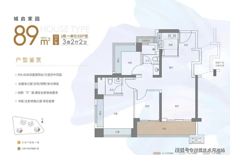 东南或西南朝向,竖厅设计,客厅有预留冰箱位,客厅,主卧,次卧分别朝南,户型一共有8个飘窗,加上阳台和飘窗使用率在90%左右。