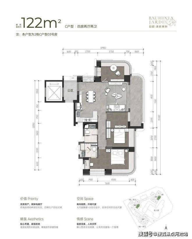 122平景观升级:03户型同样也是东南向,高区可以越过商办看水廊道景观。