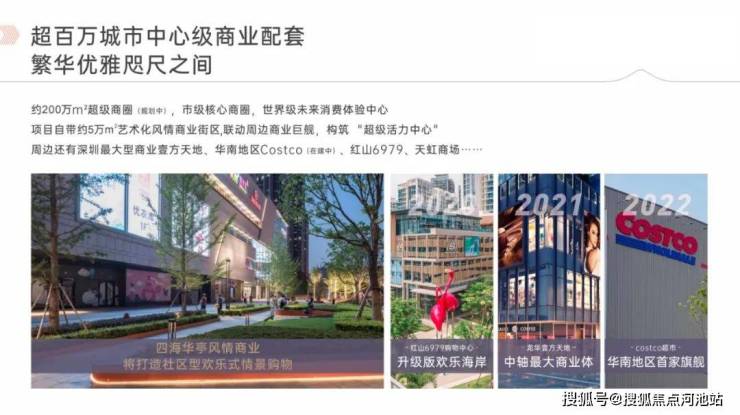 商业配套:四华侨城四海华亭自带约5万㎡艺术风情商业街区,涵盖餐饮、零售、娱乐等业态,打造“超级活力中心”。项目周边1公里内汇聚港铁天颂TIA颂荟、壹方天地(深圳最大型商业体)、红山6979等商圈,2公里范围内覆盖华南首个Costco(已开业)、天虹商场等,形成约200万㎡超级商圈网络,满足全维度消费需求。此外,片区规划中洲、华润等旧改项目,未来商业能级将持续提升。