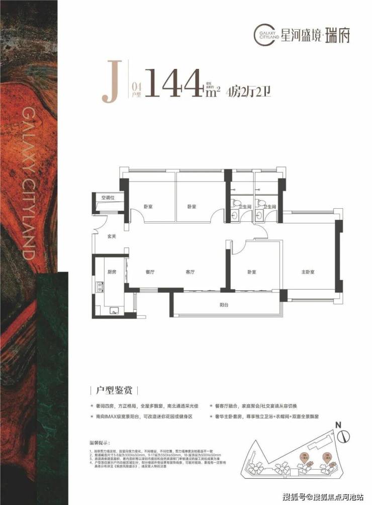 144㎡的4房2厅2卫,横厅南北通透格局,客厅6.6米开间,LDB一体化设计,全屋6面飘窗,四开间朝南,主卧南北对流,L型厨房,卫生间干湿分离,得房率约75.7%(不含赠送),阳台主朝东南向。