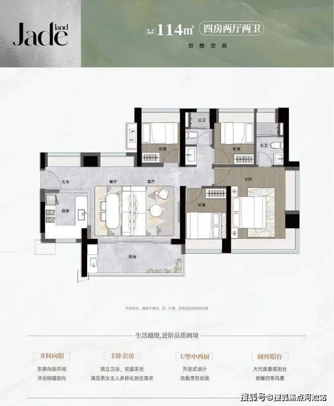 114平㎡的4房2厅2卫,设计的是横厅南北通透格局,进门入户玄关,LDKB一体化,五开间朝南,全屋9面飘窗,主卧大套间,U型厨房,卫生间干湿式分离,得房率约93.18%(包含赠送),阳台主朝东南向。