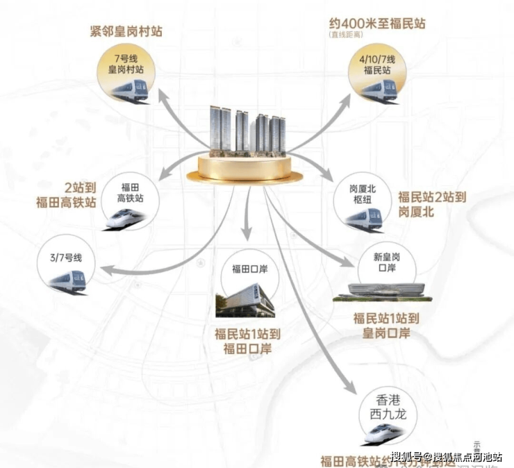 1站双口岸 ·2站福田高铁站 ·2站岗厦北枢纽 ·双地铁口 四地铁线 速抵大湾区全域,从容往来深港双城,畅享高效人生。